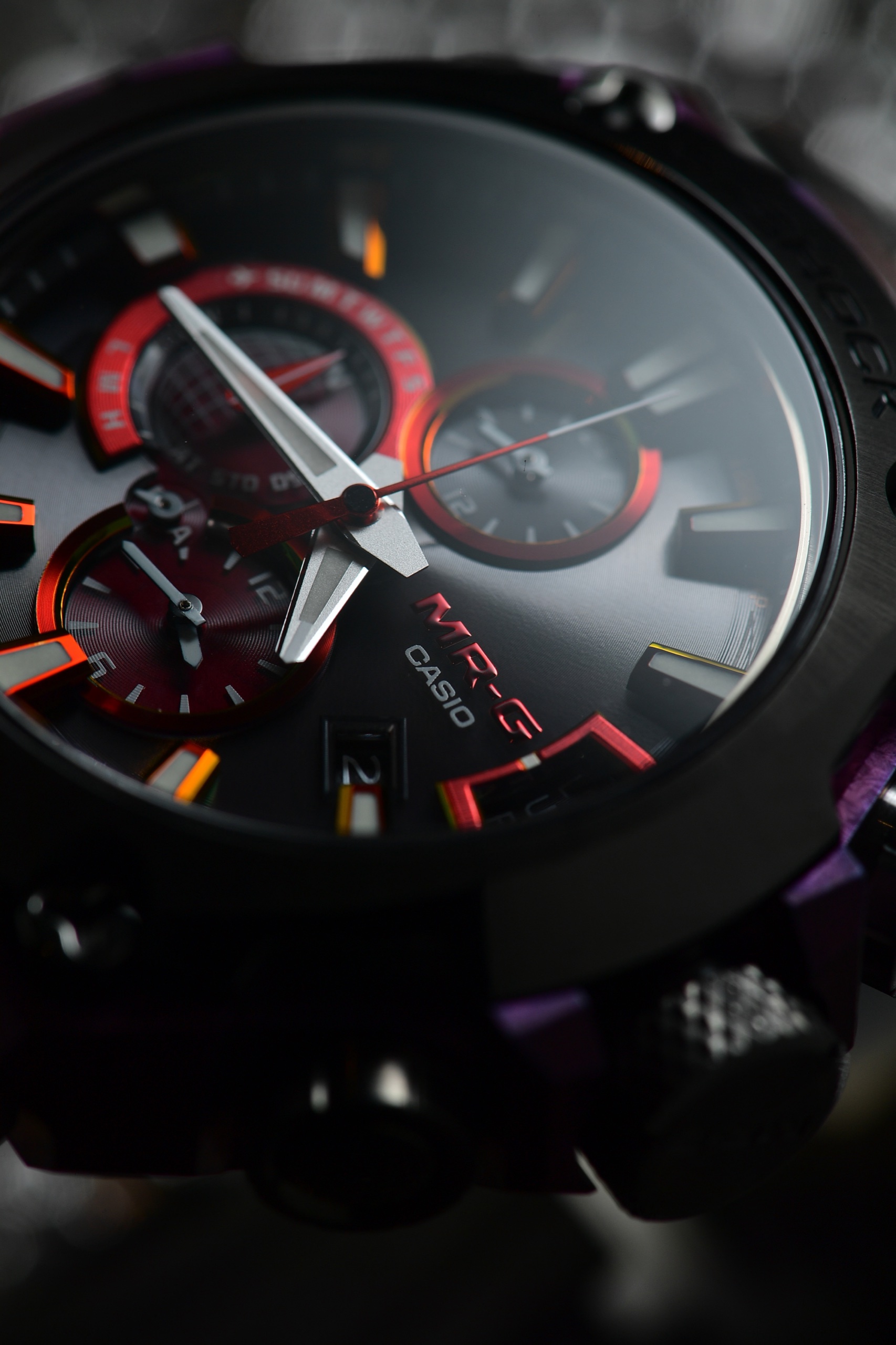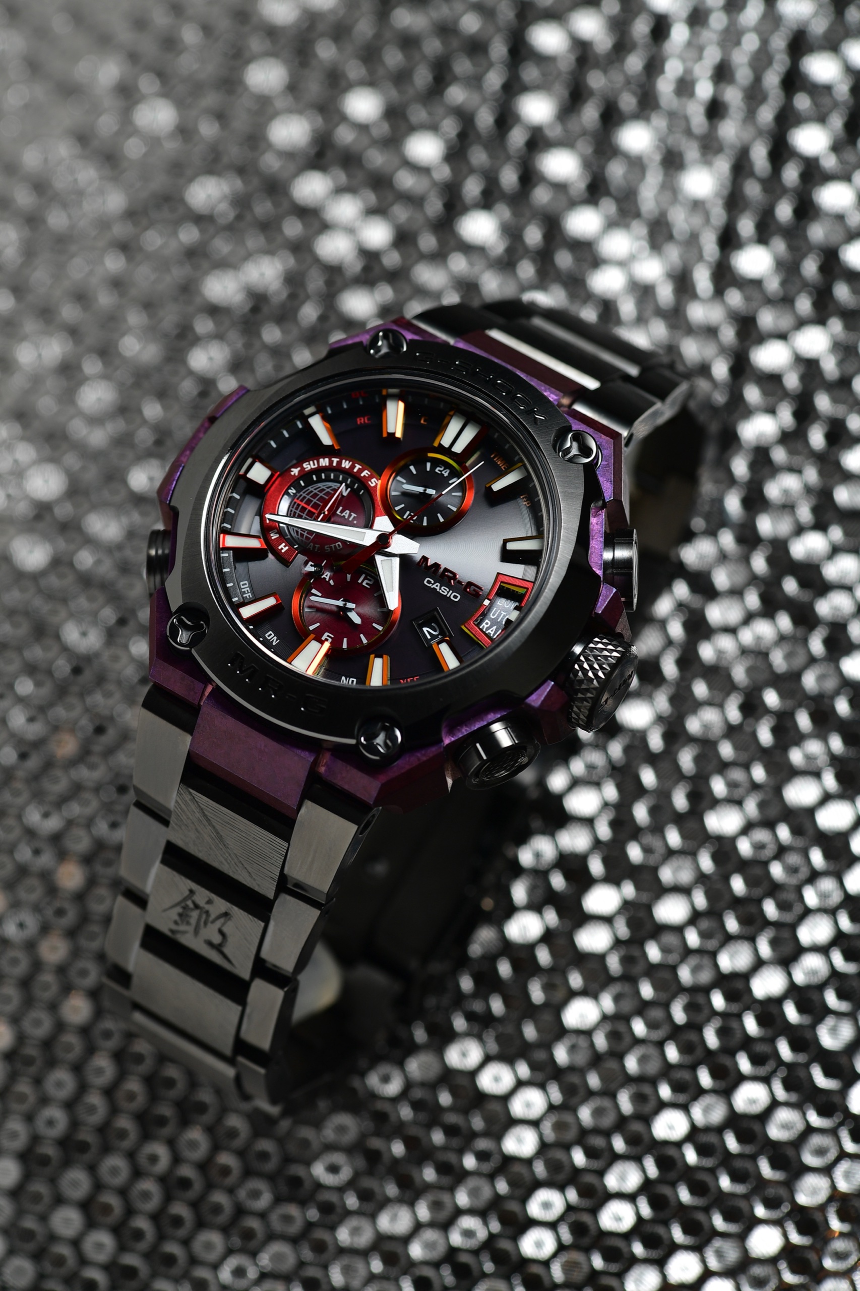 同樣是新到港的是MRG-B1000D-1A 「銀溜GIN-DAME」,新品的設計受到日本德川美術館所收藏的加藤清正「長烏帽子形張懸兜」所啟發,以傳統漆器技術為錶圈加上銀色,更以鈦碳化物處理增加硬度,錶盤則用上紅色三圈設計,可顯示兩地時間。兩款腕錶都配備太陽能充電系統,以及GPS、六局電波及Bluetooth技術,可輕易較正當地時間。