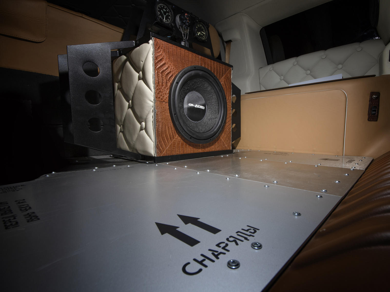 極度重型外觀之內,卻擁有走貴氣路線的車廂,主調用上米白配淺啡,以鱷魚皮包著軚盤及大量車廂範圍,另外也有戰機的機身及儀錶,確實令這台車表裡風格不一,最連貫的要算是黑色的骷髏頭機師裝飾。