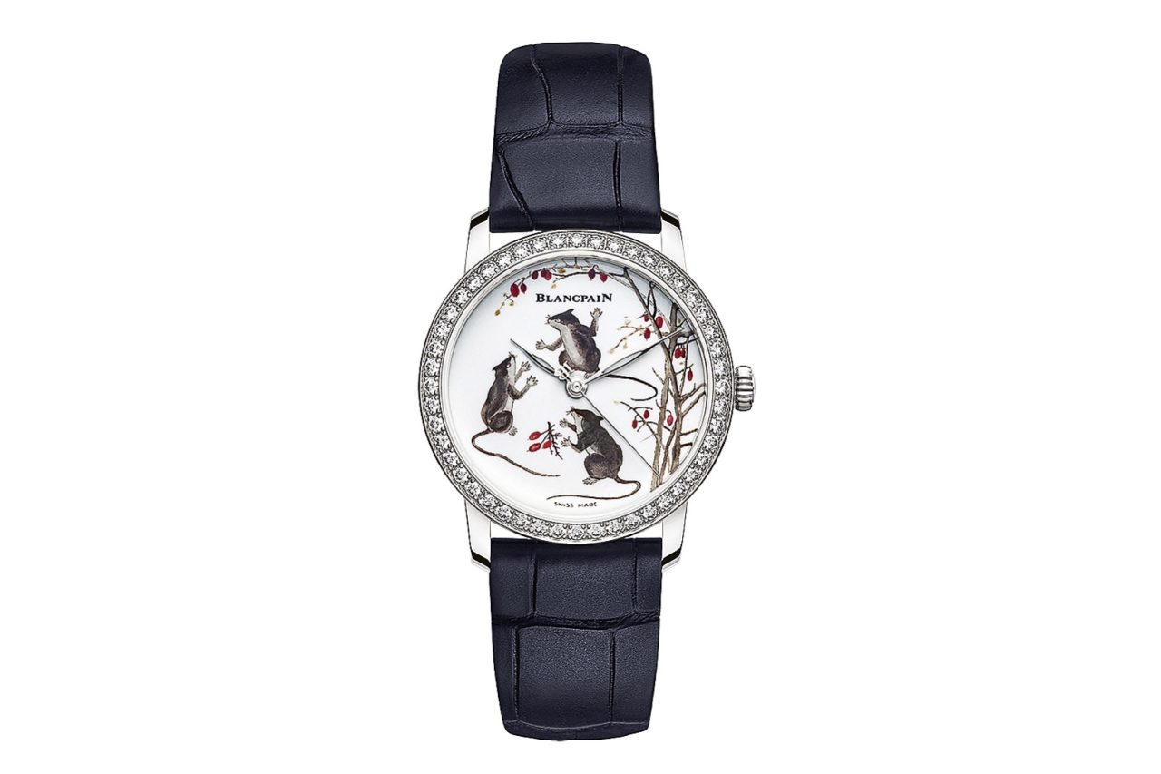 每個品牌的生肖錶各有特色,Panerai是鐫刻工藝、Chopard是日本蒔繪工藝,而Blancpain則結合青花瓷藝術和琺瑯彩繪兩大工藝,以人手一筆一劃將三隻錦鼠活靈活現地描繪於錶盤上。青花瓷原是傳統的中國技藝,燒製過程複雜,卻能產生透明及堅硬的效果。這枚鼠年錶是寶珀Métiers d’Art工作坊經過一年多時間研發、設計及生產,是品牌首次製作青花瓷錶盤腕錶,直徑三十三毫米的白金錶殼,錶圈鑲有四十八顆明亮式切割鑽石,全球僅限量八枚,令腕錶更顯珍貴。