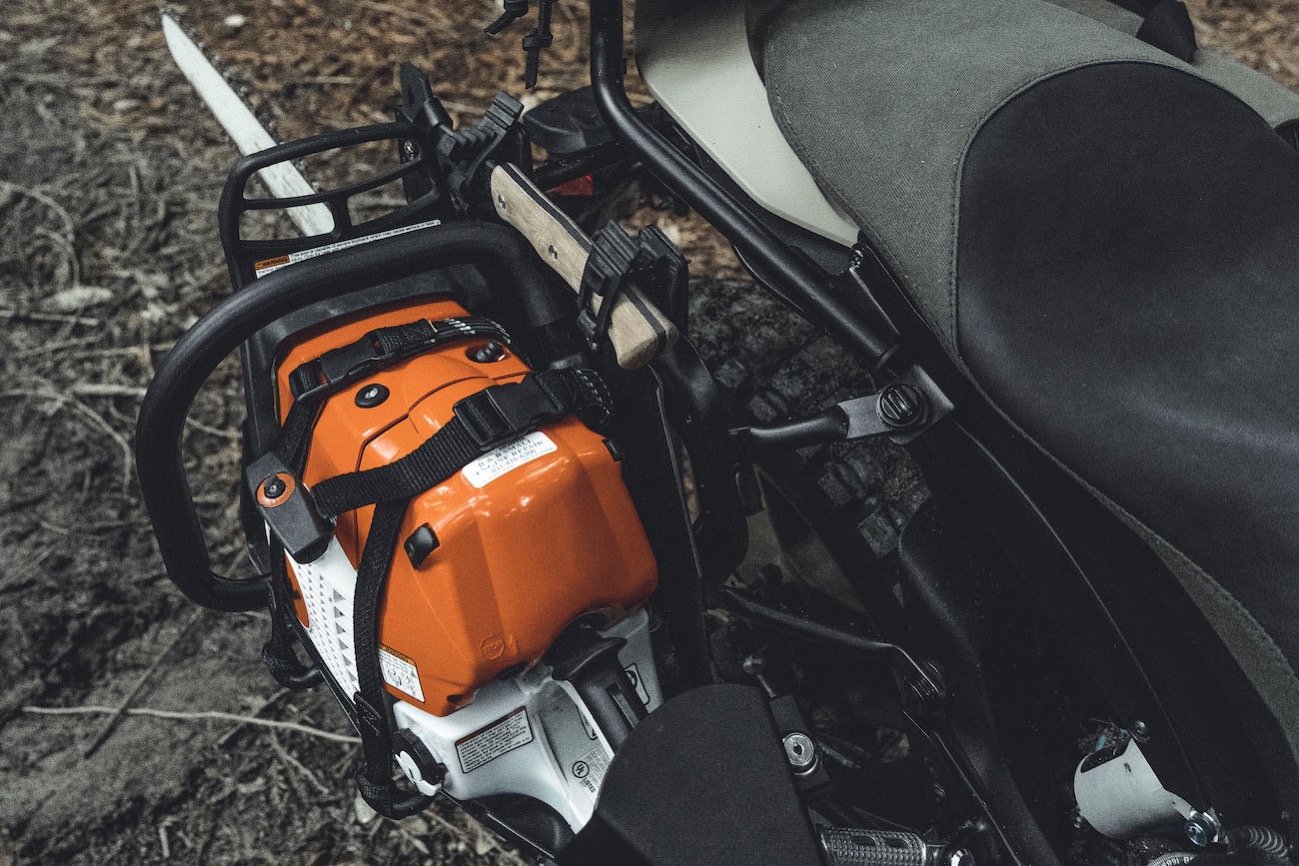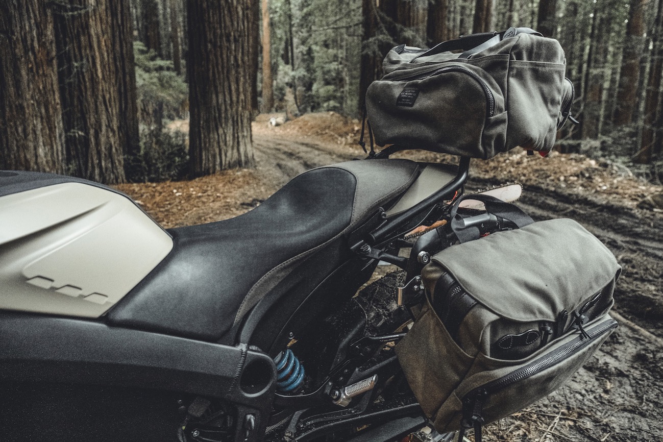 這次聯乘把全電動Zero DSR改裝成適合於森林進出的電單車。本身Zero DSR已有高達328公里續航,加上由碳帶驅動裝置帶來的157Nm扭矩、Showa前後懸掛、符合人體工學的車身設計等上乘特質,新改裝部分主要是增加電單車的越野性能及外型。全新加上的防撞桿備有輔助燈,輪胎換上全地形越野款,加設後行李架和側支架等。看到電鋸也無需感到驚訝,在樹林行駛時偶然會遇到倒下的大樹,極有可能大派用場。車上座椅則用上Filson的Tin Cloth,而行李袋則是專為這台電單車特製。