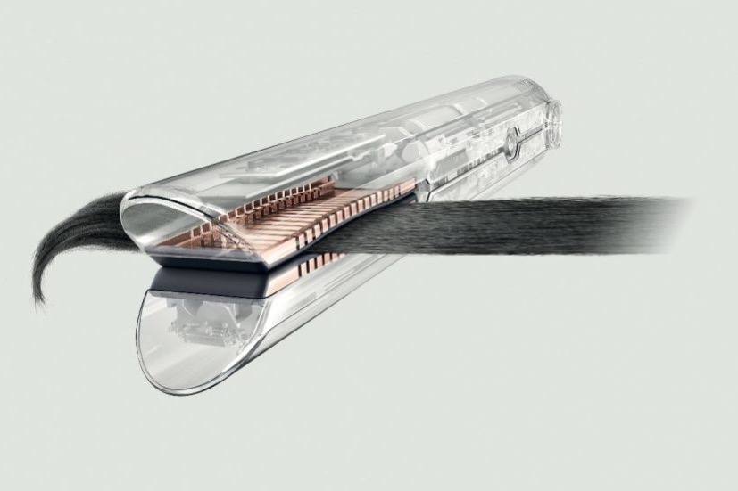 這部由Dyson創辦人及首席工程師James Dyson領導下精心研發的Corrale直髮造型器,內藏融合六種金屬的錳銅合金彎曲面板,每片金屬經精密切割至僅0.065毫米厚,所以具有彎曲彈性來包覆髮絲,順應髮束的輪廓來讓髮束均勻受力。這設計經開發團隊反覆測試及研究,最後確定能較擁有同樣效能的直髮造型器,減少50%對頭髮的熱傷害,因而此設計也獲得專利。