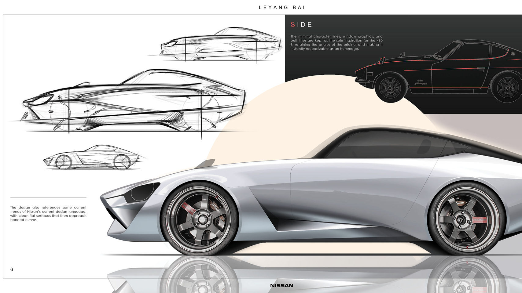 Le Yang Bai運用時下車廠設計師常用的古典現代化風格,保留圓頭燈與闊尾燈,車身比例比現役370Z更忠於原著,優雅的元祖Fairlady Z線條也更惡辣,有趣是設計師更為480Z添加NISMO版本,加入車底擾流及尾翼,非常好看。究竟這設計會否比日產廠方更好看?或許需要多點耐性拭目以待。