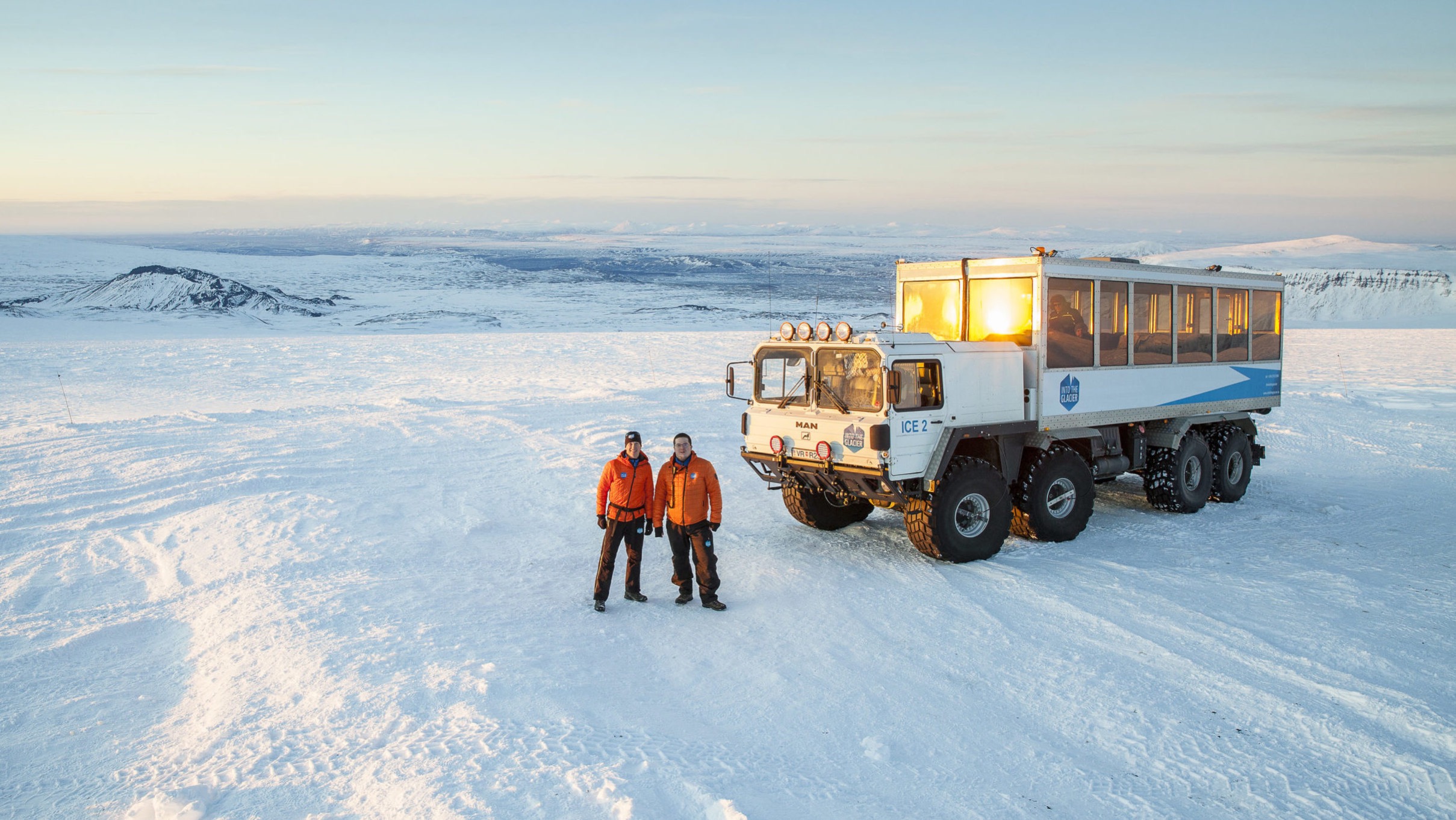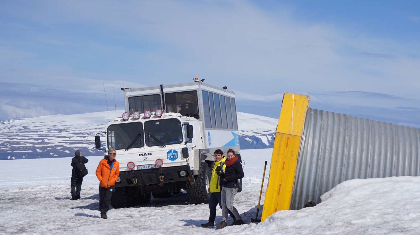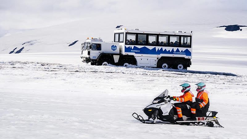 冰島首都雷克雅未克(Reykjavík)有一間旅行社舉辦「Into And Above The Glacier Tour」的親親冰川即日團,參加者可乘坐由MAN製造的最新巨型八輪雪地遊覽專車,輕鬆暢遊壯觀的冰島冰川地形。在這台可容納36位乘客的雪上怪獸內,參加者沿途更可佩戴內置十種語言的語音嚮導系統了解沿途風光,車上也配備WiFi、暖氣,務求提供最理想的旅程環境。旅程途中,參加者會乘坐雪上電單車深入複雜的地下人造冰洞遊覽,以及欣賞該地區熔岩流域和瀑布。