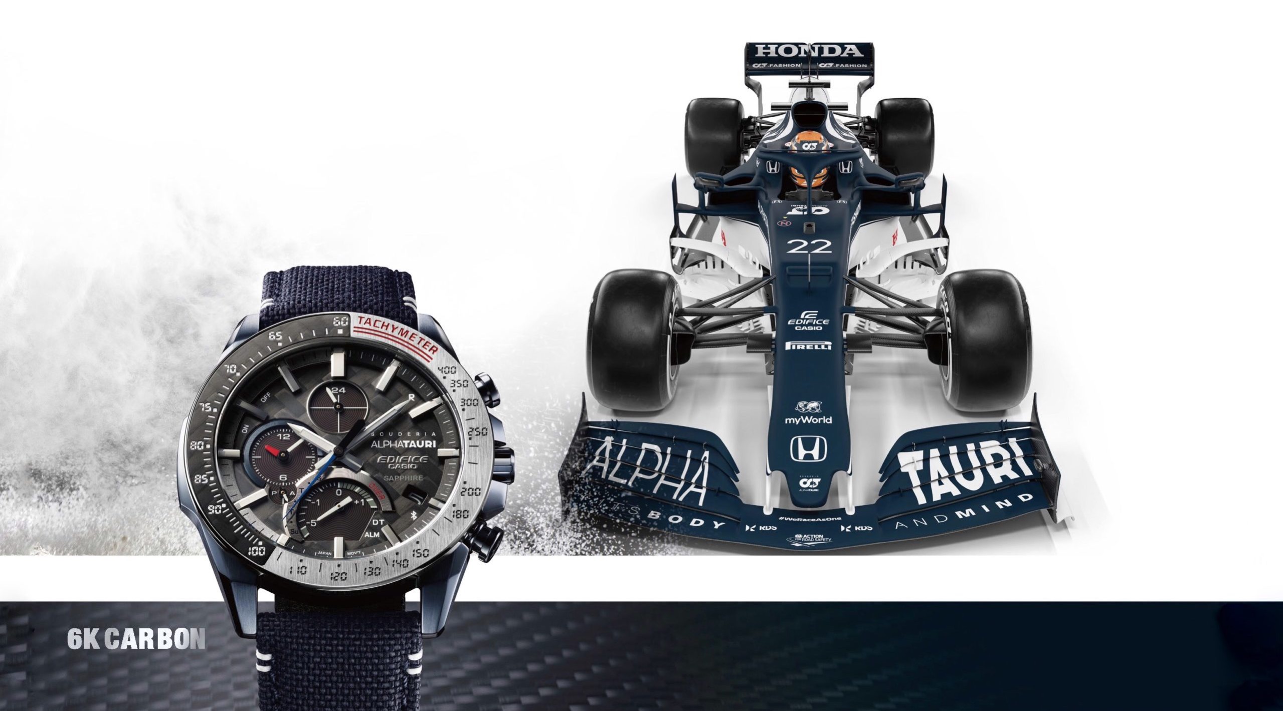 今年賽事開季之前,Edifice一口氣推出三款與車隊聯乘的限量版腕錶EQB-1000AT-1A、ECB-10AT-1A和EFS-S590-1A。它們均採用來自紅牛二隊AT02戰車的6K碳纖維物料,這種物料由多達六千束碳纖維壓製而成,強度為一般碳纖維的兩倍、不鏽鋼的二十倍,分別應用錶圈、錶盤等零件。
