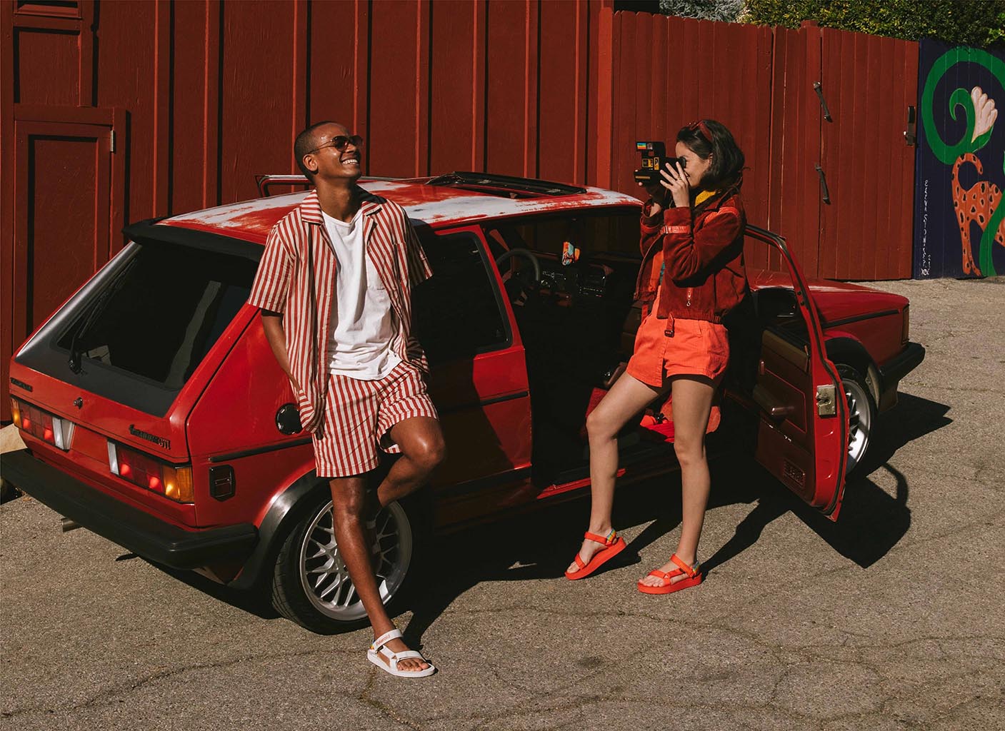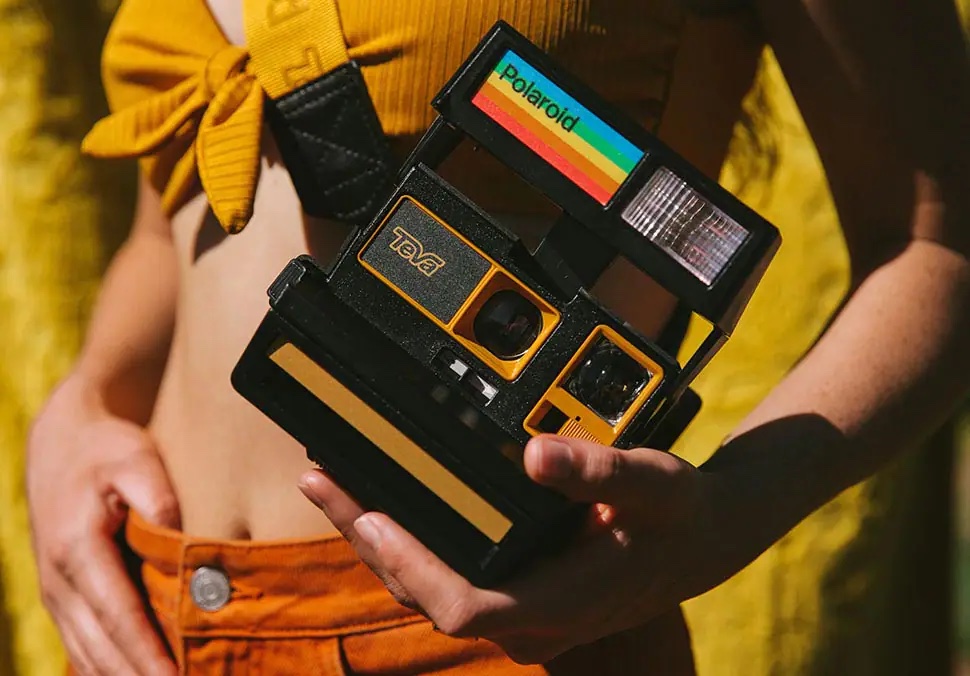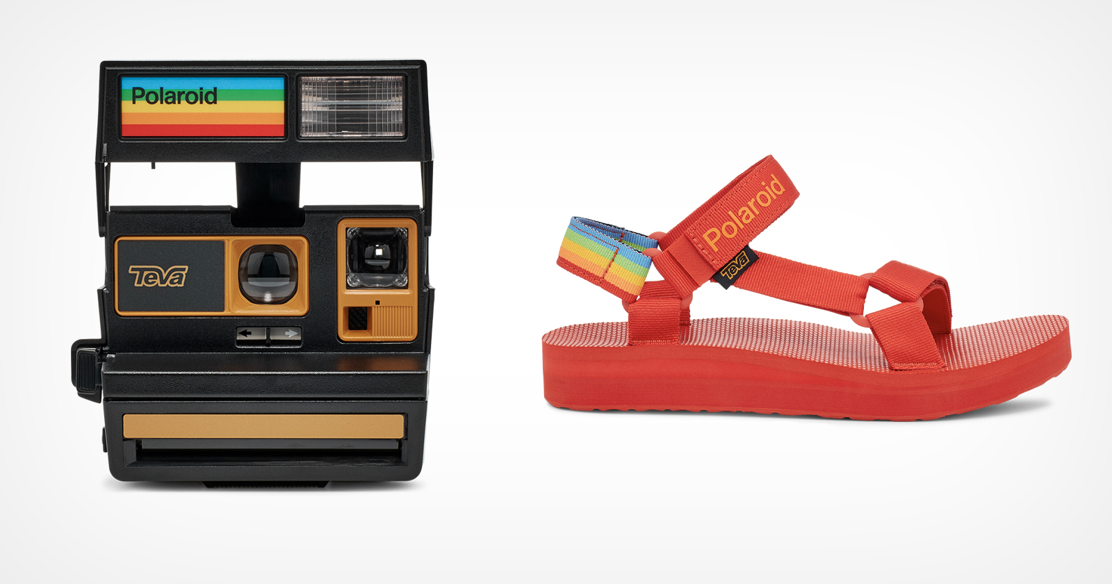 品牌最新項目是與涼鞋巨人Teva合作的聯乘系列。復古風格的系列包括兩雙別注版涼鞋,以及採用特別配色的經典寶麗來600相機。涼鞋以回收塑料及植物性材料製成,鞋跟固定帶加入寶麗來招牌彩虹顏色,提供灰白色和橙紅色選擇。至於寶麗來600相機就以黑色為主調,再以泥黃色為點綴,閃光燈左側空間放大的彩虹色,使這部聯乘作品更耀眼,系列中也包括以Repreve回收物料製成的專屬相機帶。