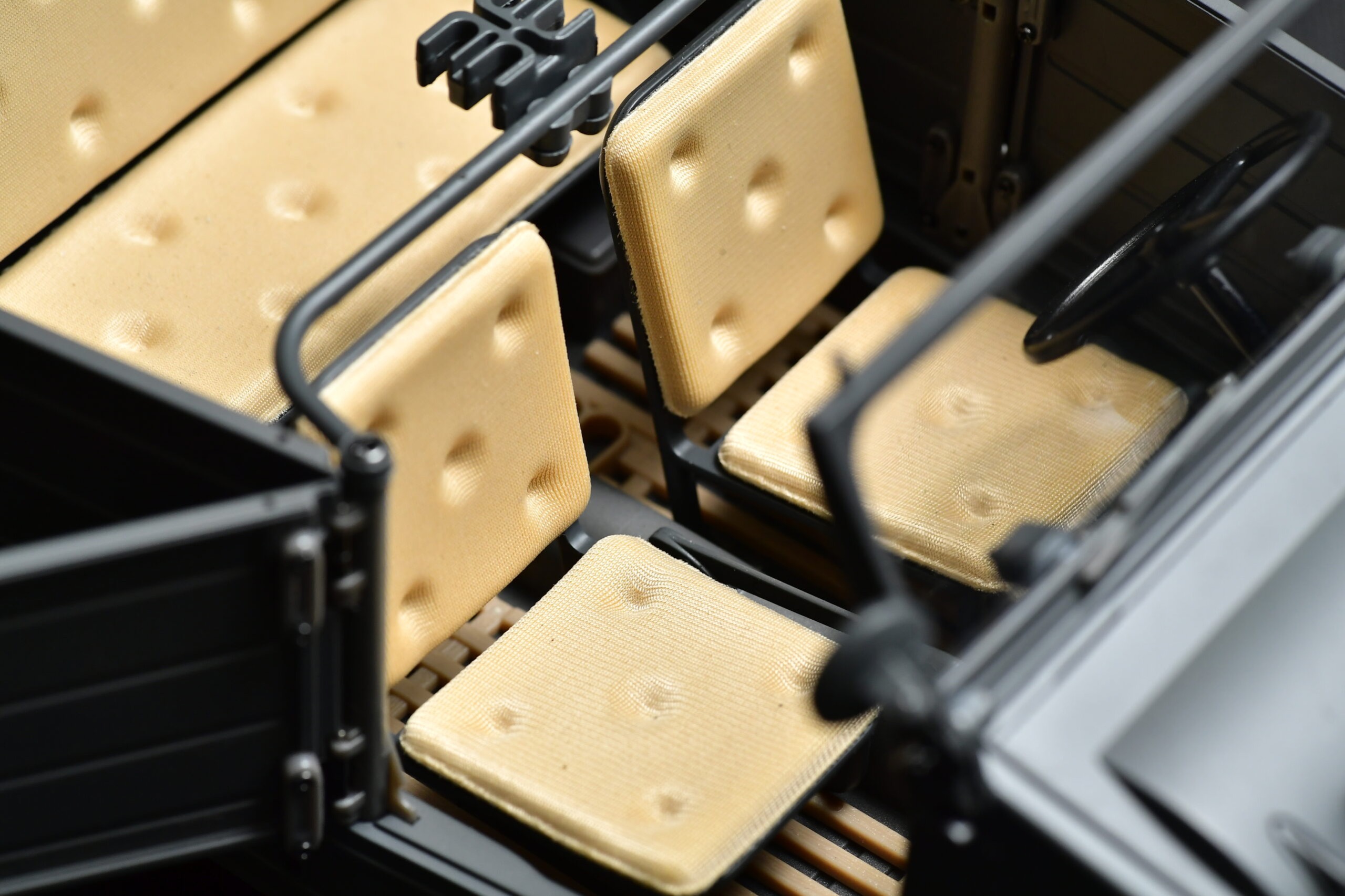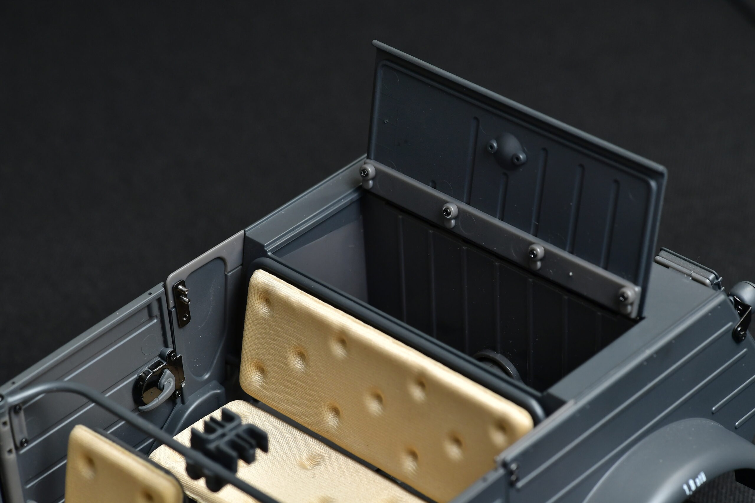 這架Type 82遙控車雖然不能配備真正的微型水冷引擎,可是所有位置、細節均形神俱似。它設有防空燈、尾指揮燈及行車大燈,所有車燈均可遙控開關,後者更可調校高低光,開燈時可遙控25分鐘。向下拉動手柄可以開門,轉向時的軚盤和駕駛席上人偶軍人的雙手也會同步擺動。開車時,要先按下軚盤後一個很小的按鈕,因為那是真車的車匙插孔位置,一切均以像真為先,就連腳位的空間,也要符合真車比例。車廂後座的位置有個仿真行李箱,正常來說,用來存放遙控車的電池箱就最好不過,可這就會影響像真度,所以寧願將電池放在車頭頭冚下,因為真車的四十公升油缸,正好就在那裡。