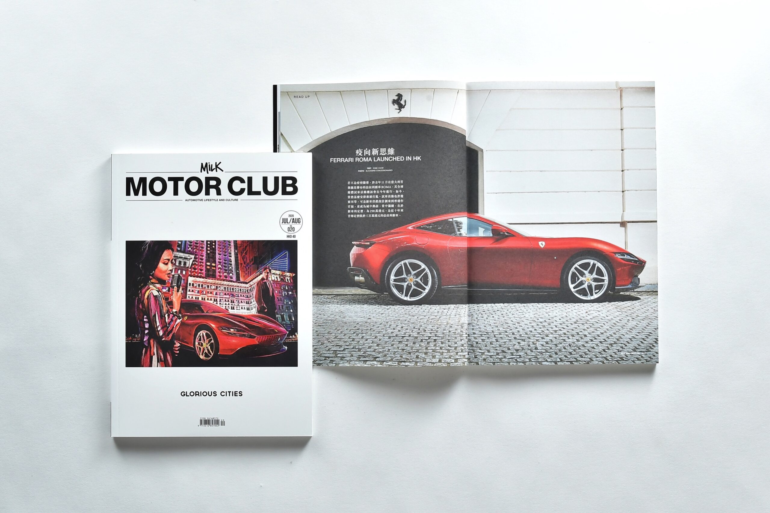 封面插畫的紅色跑車,車迷都知道是法拉利ROMA吧,新車主題是「LA NUOVA DOLCE VITA」,意思是「甜蜜新生活」。為呼應ROMA那份浪漫、喜悅的生活態度,本地代理BLACKBIRD CONCESSIONAIRES特別拍攝三部曲短片,將六十、七十及八十年代香港的美好日子呈現眼前,封面的情侶正是短片的男女主角。