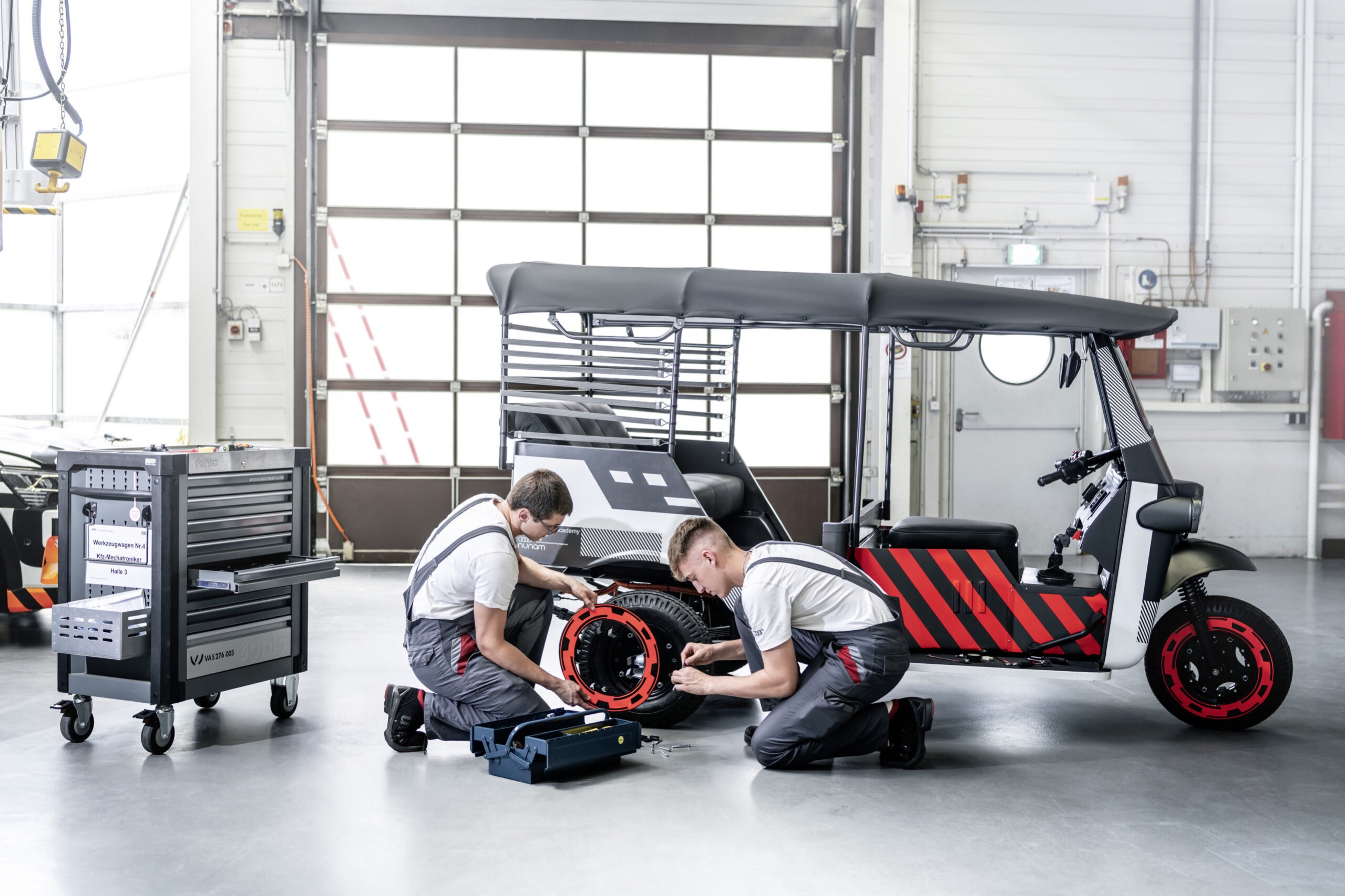 這項開發計劃首先在德國奧迪廠房內進行,收集從奧迪e-tron電動車測試車隊中曾使用的舊電池,經改裝後裝設於「篤篤」三輪車上,動力則改為電動馬達,如此全新的電動「篤篤」便告完成,後座可載兩名乘客,目前已有三台在測試中,並準備於明年運往印度進行實地路試。