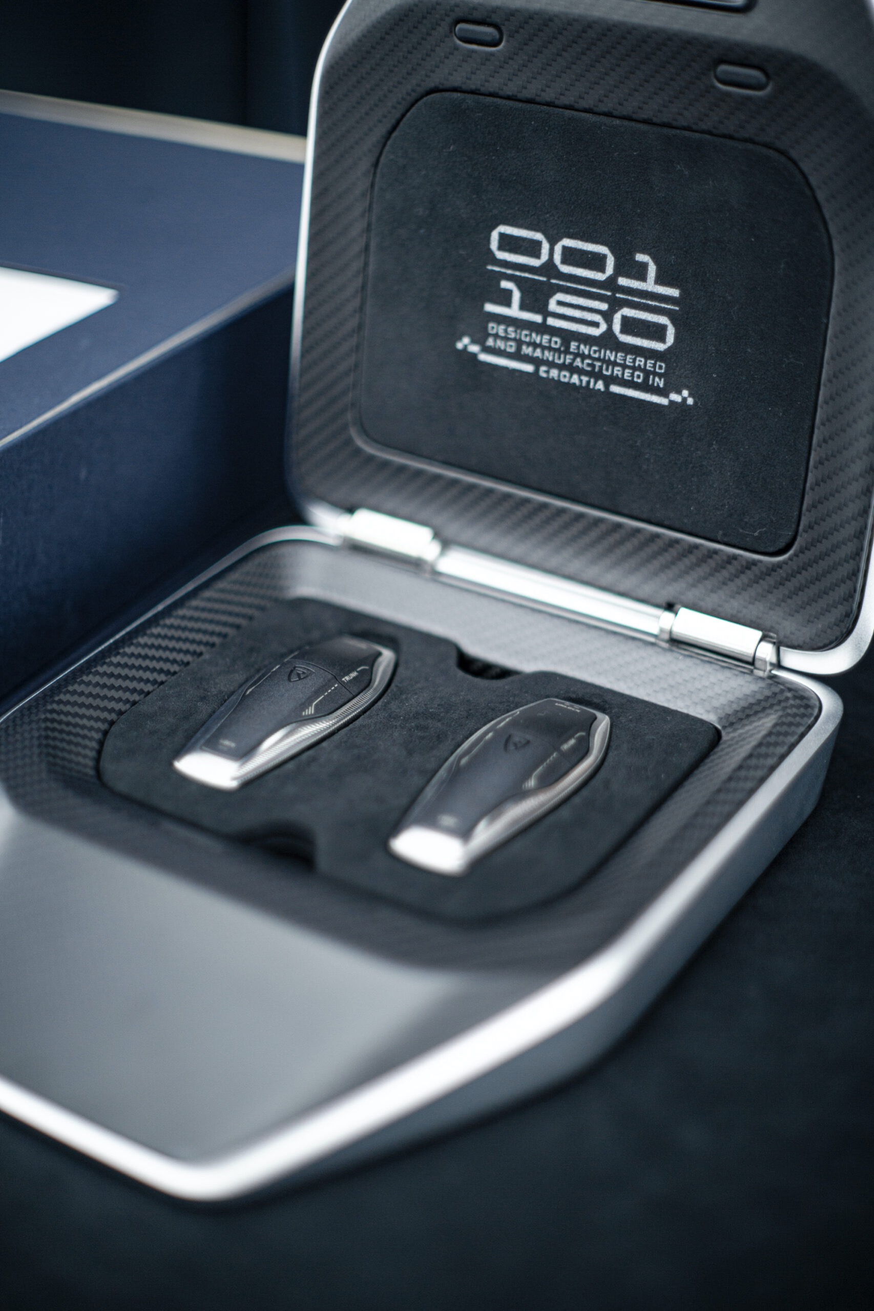 限量生產150台的Nevera,全由客戶進行定制選項,對於#001跑車,羅斯堡選擇一個更具侵略性的形態,把此車設計為「蝙蝠車」姿態,全黑的車身漆面、拋光的車輪和亮黑色制動卡鉗,配合內飾同樣採用全黑色 Alcantara物料,車內有羅斯堡簽名,001/150的銘牌,這台Nevera將是摩納哥第一輛全電動超級跑車。