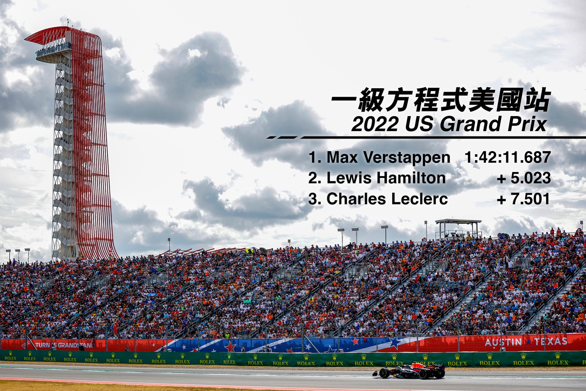 咸美頓盡全力只得第二,陸克萊回到頒獎台位置,為法拉利追回一點分數,另一台紅牛的佩雷斯第四。賽後多達五位車手被罰,最無辜的是艾朗素碰撞後原本追回一席第七,被哈斯車隊上訴其賽車在有破損下比賽,結果投訴成立被罰三十秒,排名跌出十名之外,不過隊友奧干從維修站起步,卻因此升上第十獲得最後一分。