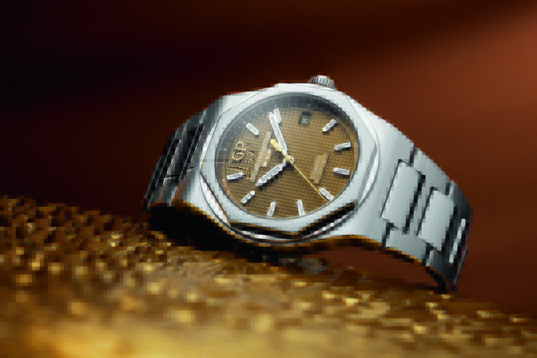 Laureato系列早於1975年面世,是GP旗下最受歡迎的不鏽鋼運動錶系列。此系列採用酒桶形錶殼,配搭八角形錶圈,錶盤具有精緻的巴黎釘子紋理裝飾,應用設計簡潔的鉛筆形指針和鑲貼式時標。雖然Laureato系列也曾採用過幾種不同顏色的錶盤,但配備黃銅色錶盤卻是首次,也想不到由巴黎釘子營造出來的光影效果煞是迷人,配搭同色的中央秒針,更加強腕錶的復古氣息。