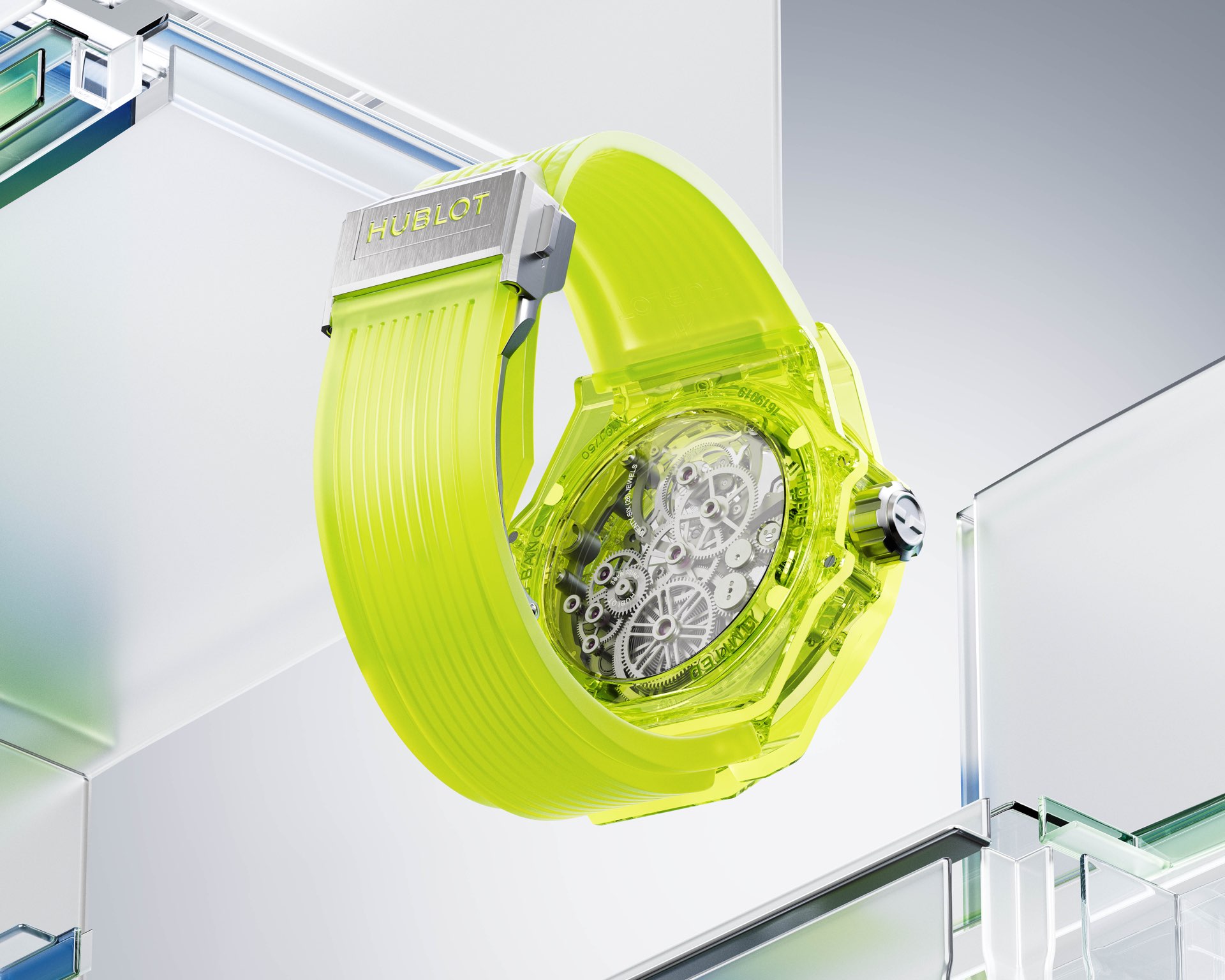 這款最新發佈的Big Bang腕錶採用螢光黃色的SAXEM錶殼,直徑達44毫米,內置自家製造的HUB6035自動上鏈陀飛輪機芯。這枚機芯經過高度鏤空工藝處理,基板和主要搭橋均以透明藍寶石製造,加上裝置只佔極少空間的微型自動陀,以及採用無錶盤的設計,讓光線能夠直接穿透整個錶殼,提供通透的視覺效果。機芯焦點固然是六時位飛行陀飛輪,它與置於十二時位的微型自動陀形成代表幸運的八字形佈局,兩者的往復活動姿態也互相輝映。