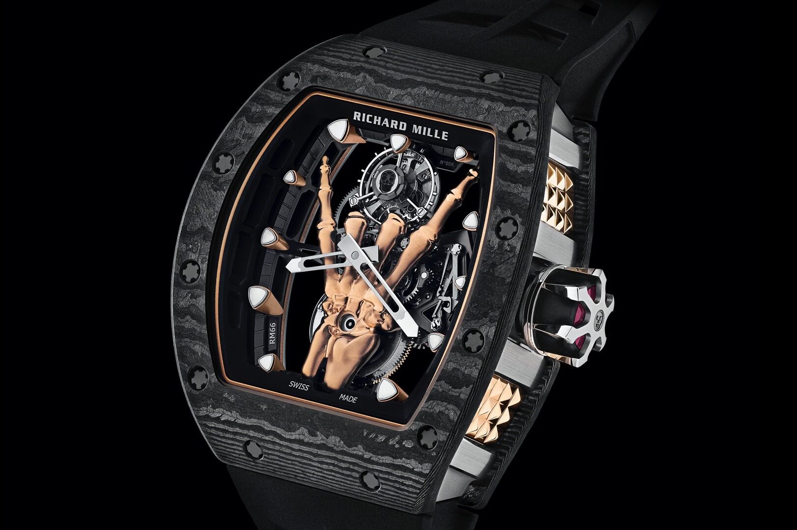 RM 66的酒桶形錶殼以極輕巧而堅固的Carbon TPT碳纖維物料製造,配襯5N紅金飾片。錶冠頂部具有八幅式鑲爪裝飾,別具歌德式美學味道。可惜此錶只限量製造50枚,又怎夠滿足輪候冊上的品牌支持者和數目龐大的搖滾樂迷呢?