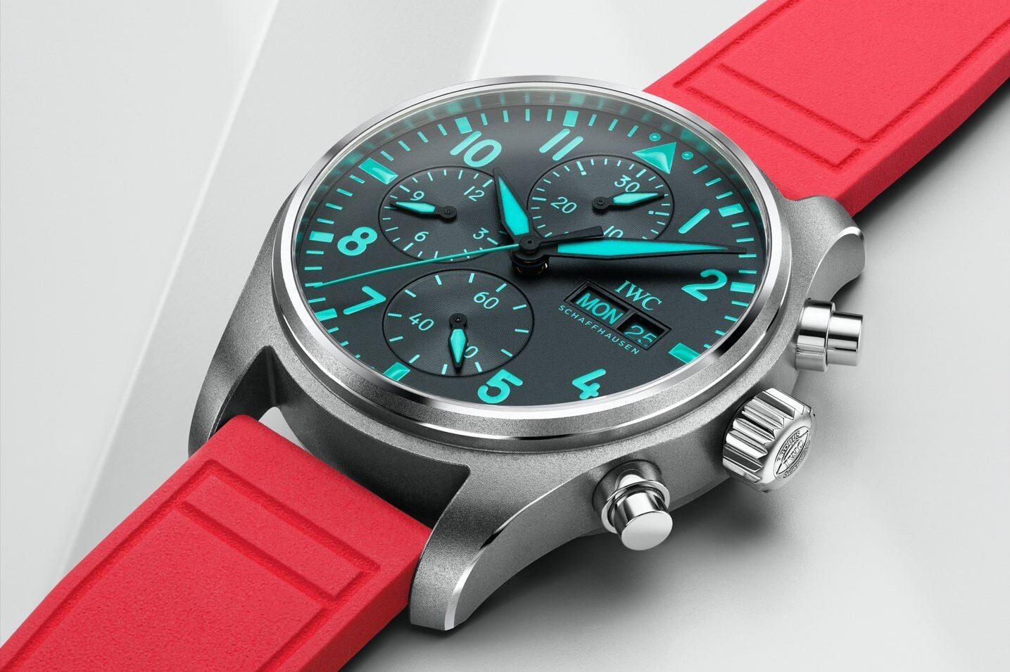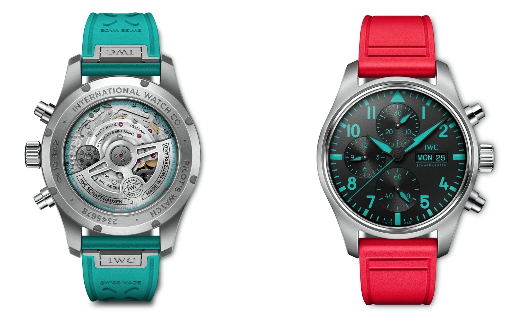 這款限量版腕錶的參考編號為Ref. 388114,與去年推出的聯乘款式Ref. 388108十分相似,均以41毫米直徑的Pilot’s Watch Chronograph為基礎,採用黑色錶盤配搭孔雀綠色指針、時標和刻度,但這次除了配搭與車隊隊色相同的孔雀綠色橡膠錶帶外,還搭配一條與邁亞密陽光一樣明艷照人的亮彩粉紅色錶帶。這個限量款式同樣供應給包括車手、機械士、工程師、設計師、空氣動力學家、領隊在內的所有車隊成員使用,是為一款正式的平治車隊隊錶,觀眾不妨細仔留意。