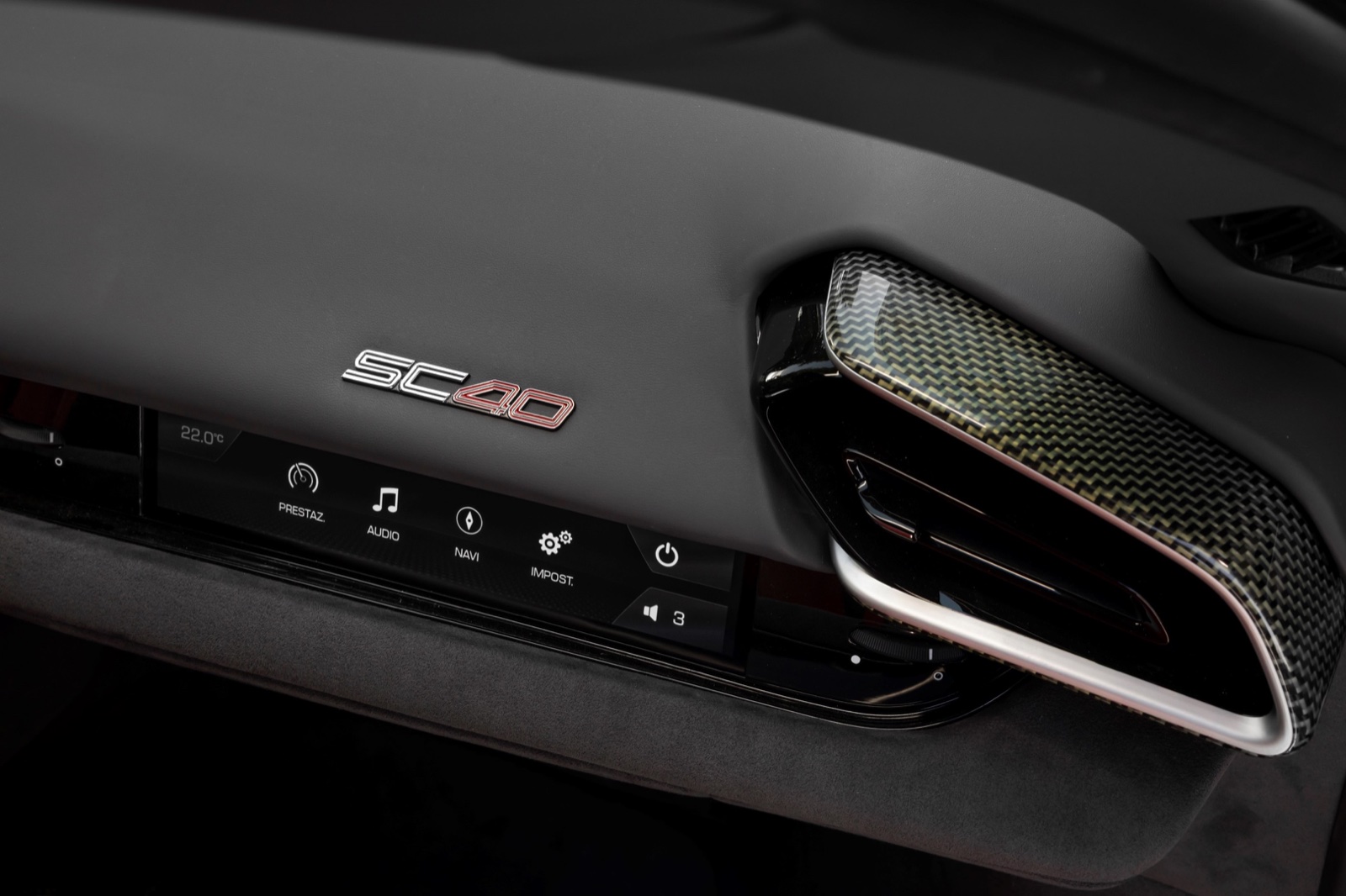 SC40的車廂內裝同樣有著強烈的F40味道,Special Projects團隊將大量Kevlar物料,或者精準一點說,是將大量經重新研發的Carbon-Kevlar複合材料,應用在SC40的腳踏區、座椅後方、部分地墊表面、軚環、儀錶板、引擎倉和行李箱等位置。而在車身右側,更有特別的SC40標誌。此外,它的四個輪圈,亦是專為此車製造的,結合了經拉絲工藝處理的鑽石切割金屬面與黑色輻條,令人單看四個輪圈,便知道這是全球獨有的SC40。