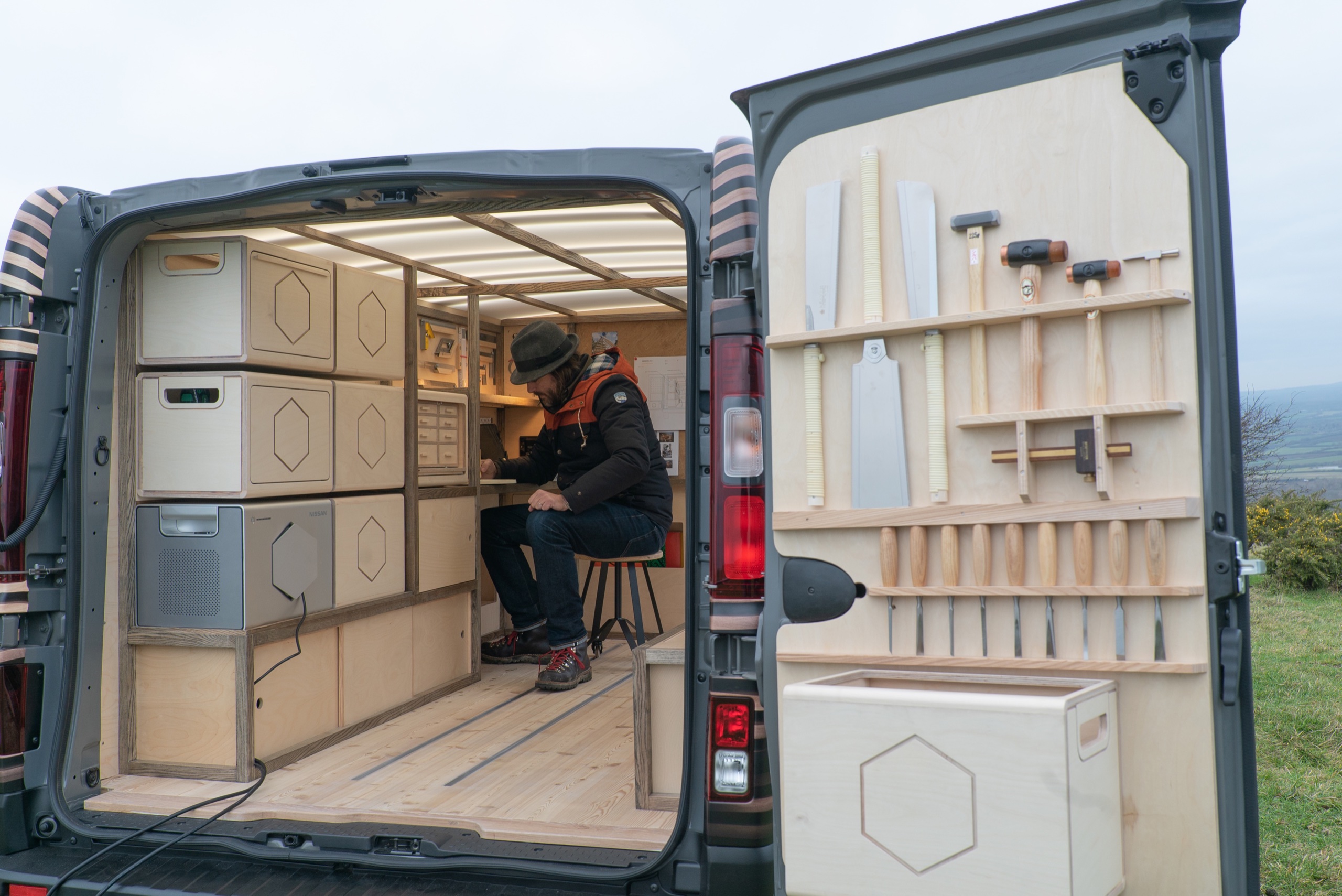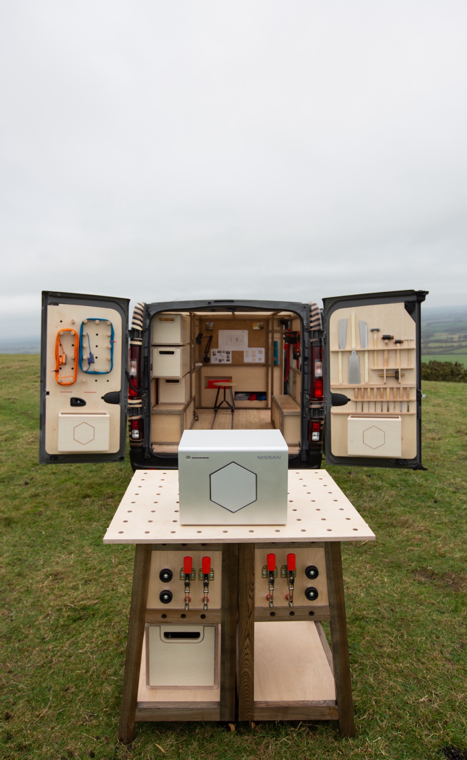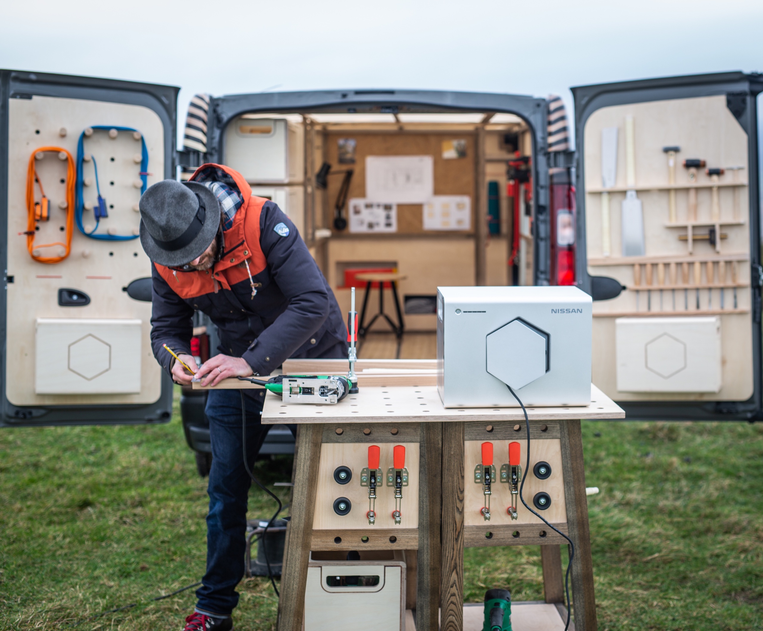 車身尾廂經木材間隔改造,內裡有許多實用工具,包括以路軌固定的工作木枱及工作椅,若要處理大型物品或者進行打磨,甚至燒焊工序,則可使用能移至戶外的工作枱。概念車設有Leaf純電車電池的特大移動電源,名為Energy ROAM的電池容量達700Wh,能支援1,000瓦特輸出,應付車上電動工具。另外車頂亦加上太陽能發電模組為Energy ROAM進行充電,不過廠方未有透露充電時間。