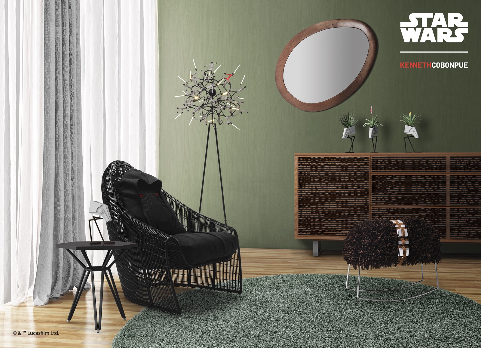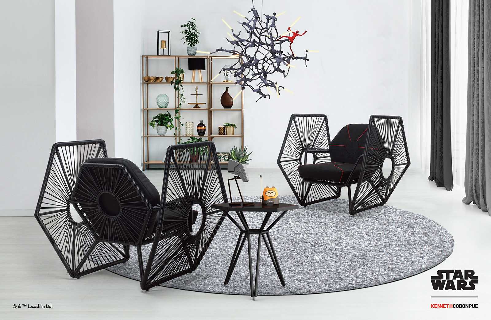 最初迪士尼聯絡Cobonpue時,他感到不少壓力,要把大家熟悉的角色不俗套地放到家具上確實不容易,他希望能夠保留自己一向的設計風格,加入菲律賓傳統手工編織工藝。系列共有七款家具,包括三款扶手椅丶角几、搖搖椅和兩款燈具,全都有淡淡的電影元素。例如黑武士扶手椅中,只在黑色椅子坐墊上以同色繡上黑武士的模樣;TIE戰機變成扶手椅,兩旁的設計更以人手編織;在燈具上則可找到一班絕地武士以激光劍把空間照亮。就算是不懂得《星球大戰》的人士,也會欣賞這系列時尚家具。