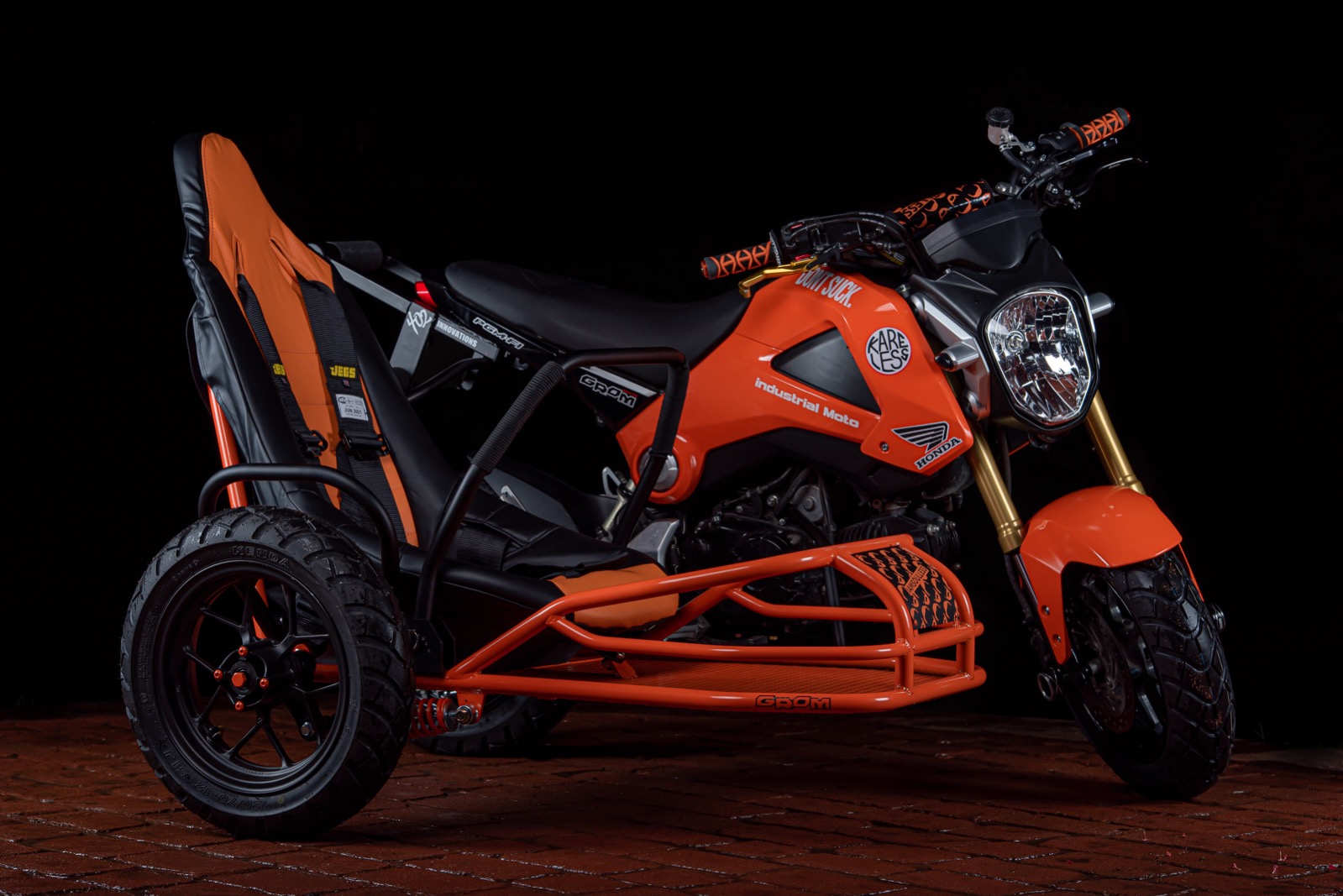Industrial Moto在沒有收取費用下改裝iamsoulless的Honda Grom,零件成本及運輸費則透過眾籌募集,這部別具意義的電單車已交回iamsoulless。Project Angel上的邊車特別因應Nick的情況而製造,以賽車式座椅配五點式賽車安全帶,再加上多個額外扶手。團隊花近兩個月時間製作,更找來當地的小童親身測試,確保設計能夠正常和安全運作。邊車整體設計跟隨iamsoulless的自家標誌,細節用上搶眼的橙色跟黑色配搭。